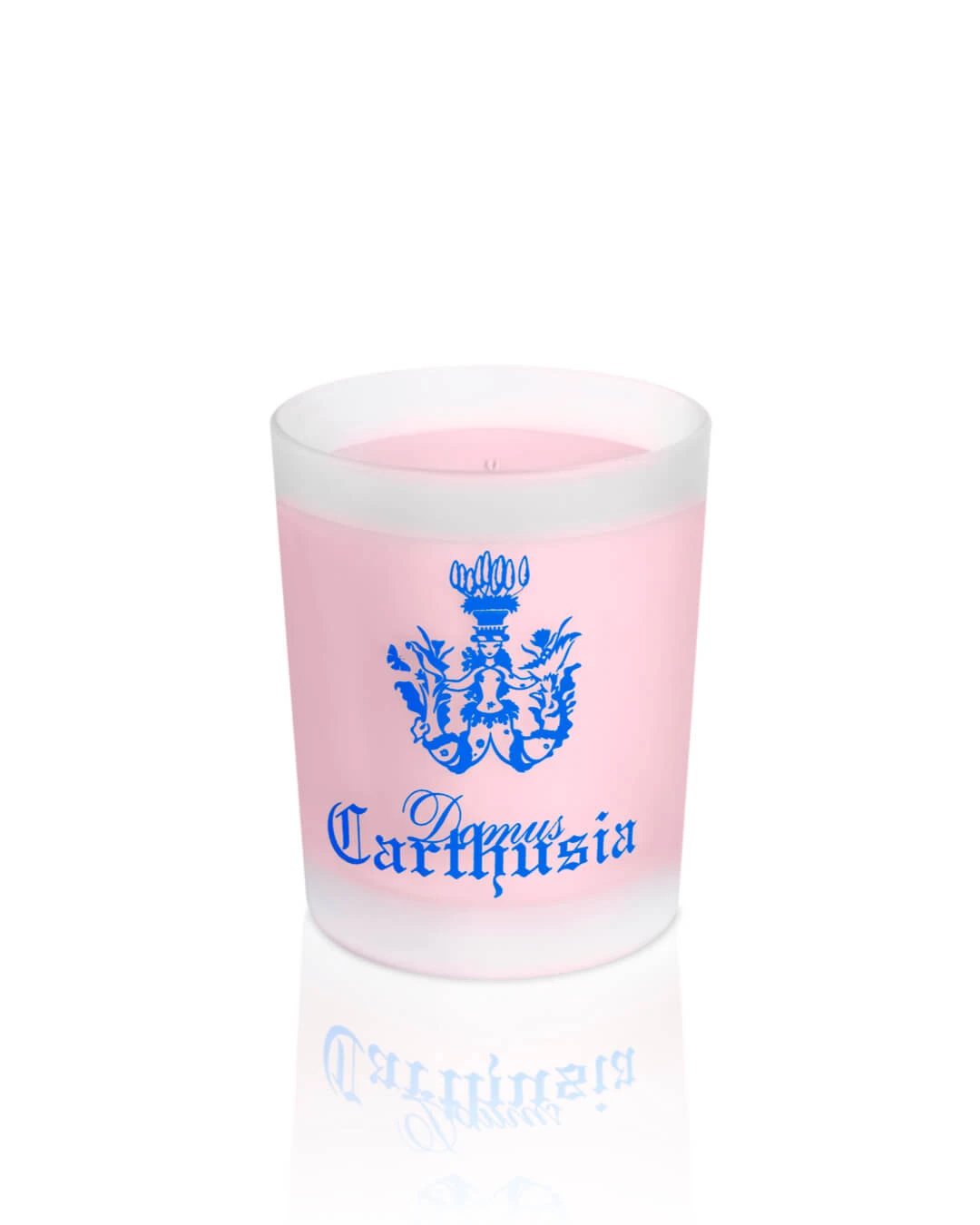 Un bicchiere sabbiato con inciso il logo Carthusia racchiude al suo interno una candela profumatissima alla fragranza Corallium, ideale per profumare ogni angolo della casa.